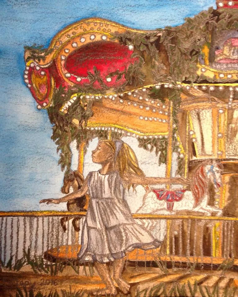 The Karuizawa New Art Museum (KaNAM) currently shows a painting from my new series about abandoned places. After my Circus of Curiosity, I’m now throwing the viewer into the surreal world of an amusement park graveyard. A girl is dancing round and round like a carousel, but the pulsating life of the amusement park stopped. Nature already reclaimed the place and transformed the brightly colored carousel into a rusting and rotting still-life portrait. No more whirling rides and bizarre attractions.